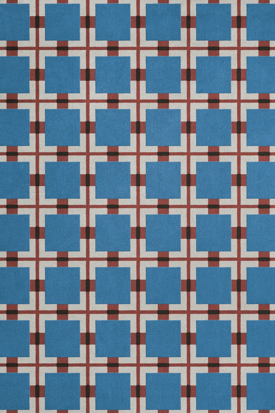 A bold check pattern composed of soft blue blocks framed by fine linear detailing in warm tones. The interplay of color and geometry gives the rug a playful yet ordered rhythm, making it a standout piece that still feels balanced within a space.