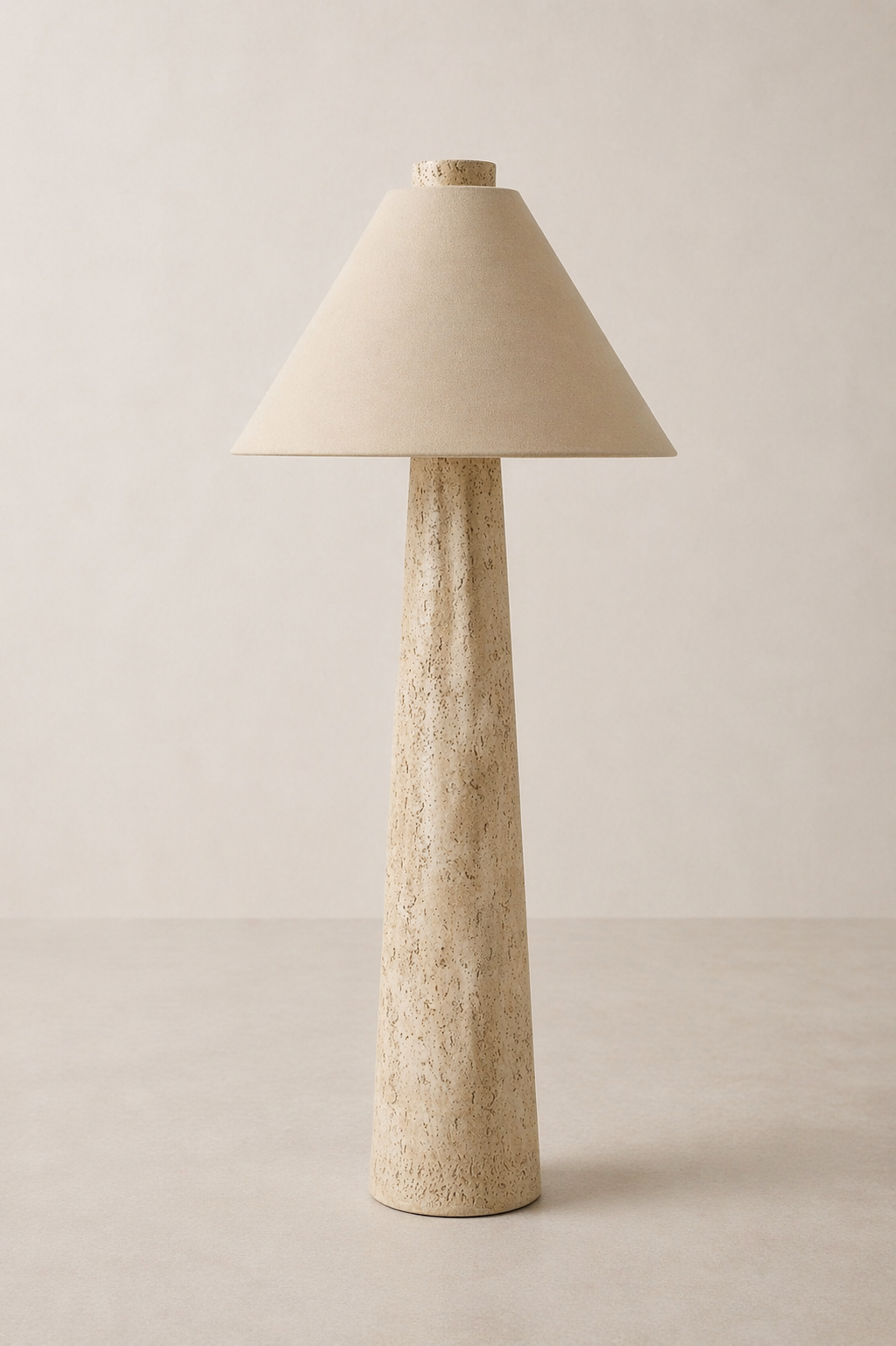 Standing 160cm tall, this floor lamp pairs a solid travertine column base with a natural linen drum shade. A statement of quiet luxury.