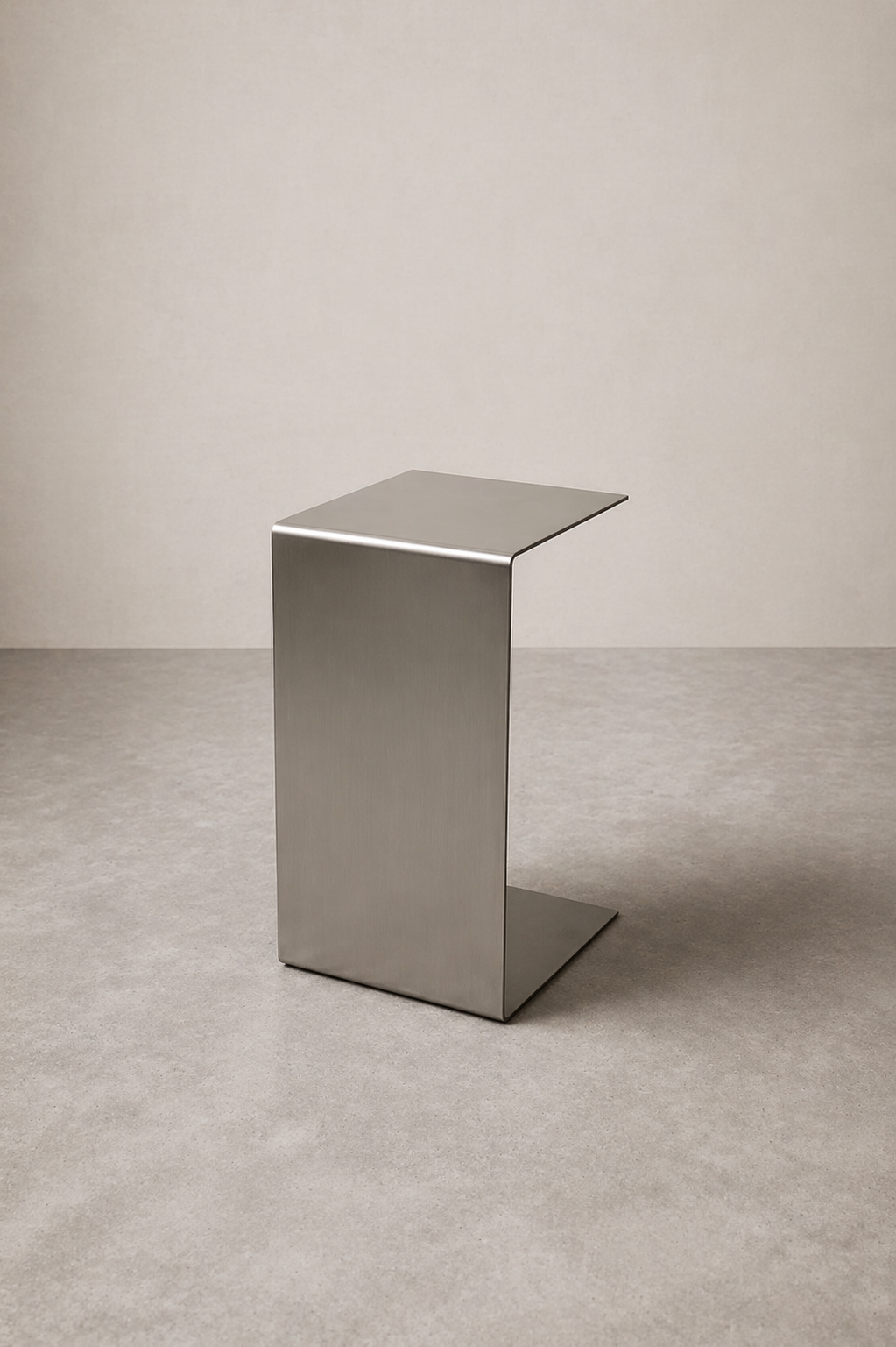 A compact side table with a clean C-shaped form designed to slide over seating. Its cantilevered structure allows it to function as a convenient surface for everyday use, keeping essentials within easy reach.