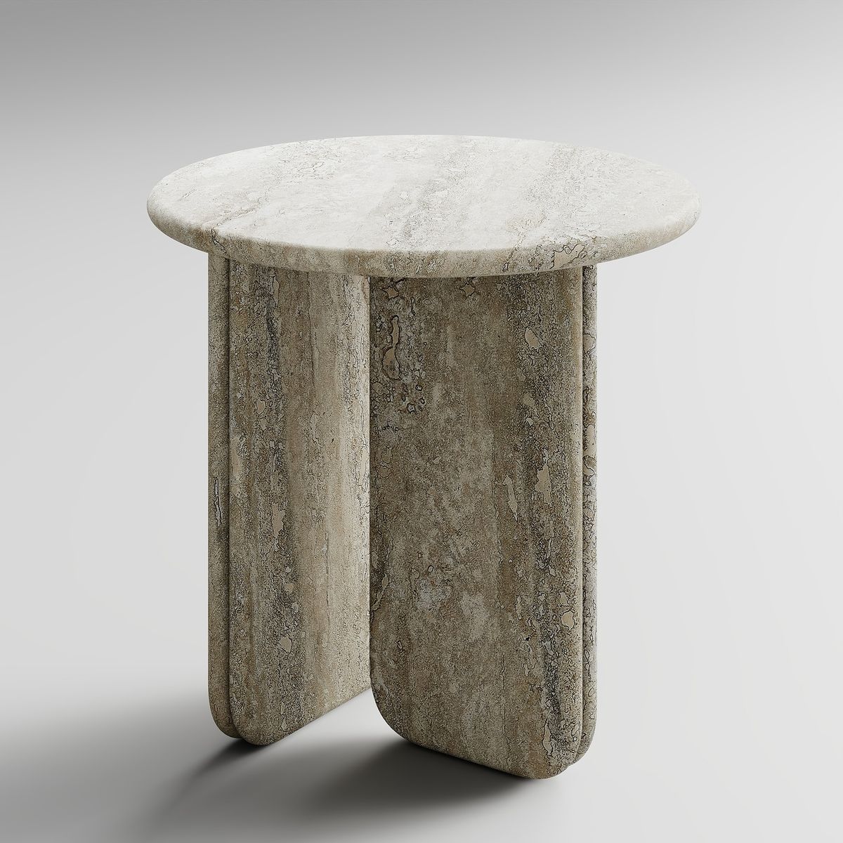 A side table with a circular top and solid, curved supports. The form creates a sense of weight and stability, making it a functional piece with a bold, sculptural character.