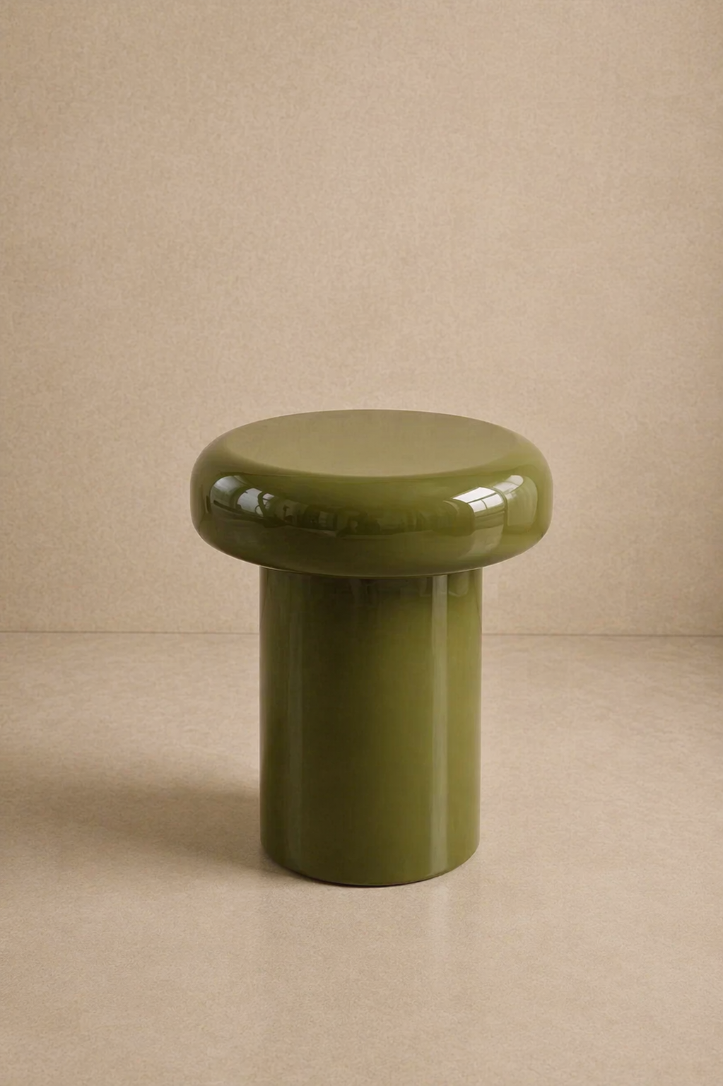 A compact side table defined by its soft, rounded silhouette and translucent glass form. The thick top gently overhangs a cylindrical base, creating a balanced, sculptural presence. The tinted finish adds depth and richness, shifting subtly with light.