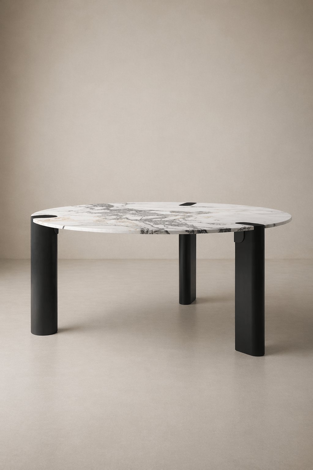 A statement meeting table defined by contrast and balance. The circular stone top appears to float above a series of solid cylindrical legs, creating a composition that feels both grounded and refined. Designed for collaborative environments, the form encourages equal engagement around the table while bringing a strong material presence to the space.