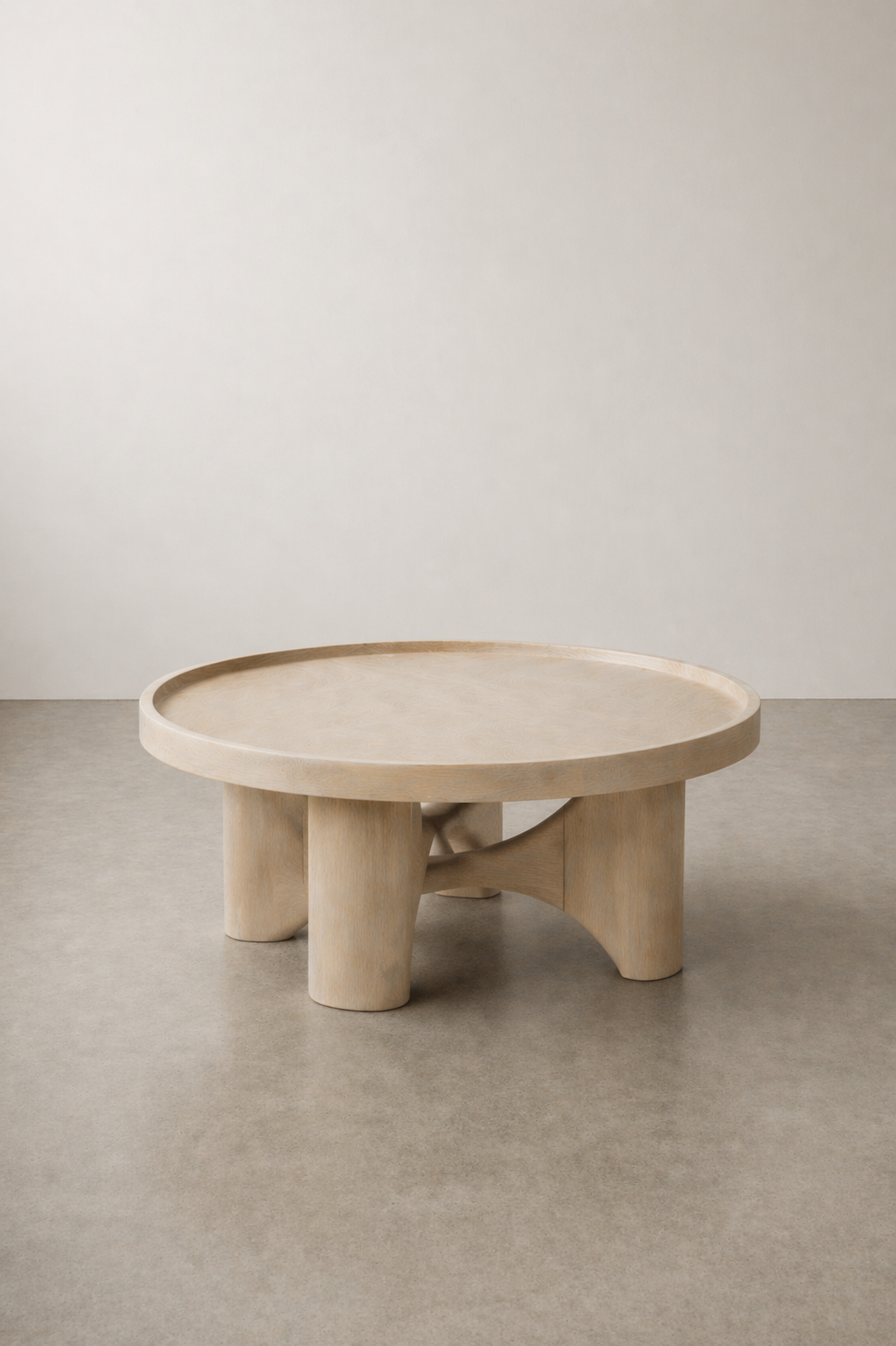 A sculptural coffee table defined by its circular tray-like top and softly carved base. The recessed surface creates a contained, functional plane, while the intersecting leg elements form subtle arches beneath, adding depth and visual rhythm. Balanced and grounded, the piece blends utility with quiet architectural expression.