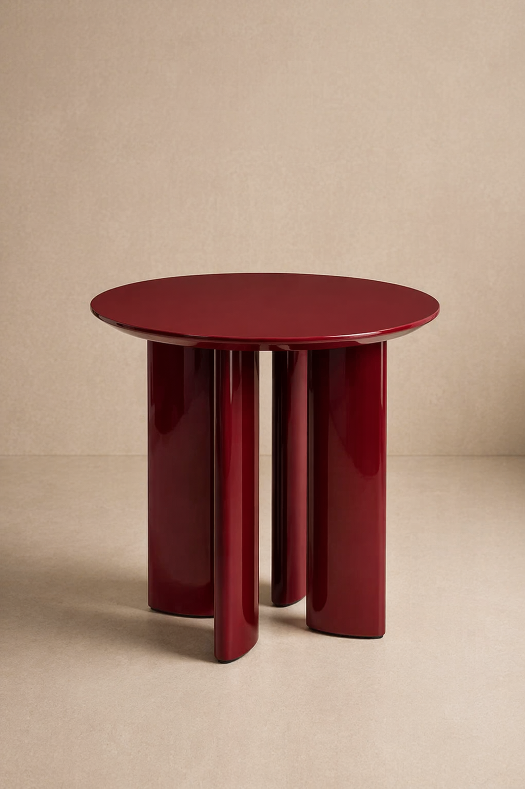 A bold side table defined by its high-gloss finish and rhythmic cylindrical base elements. The circular top rests on three rounded supports, creating a sculptural composition that plays with reflection, depth, and color intensity.