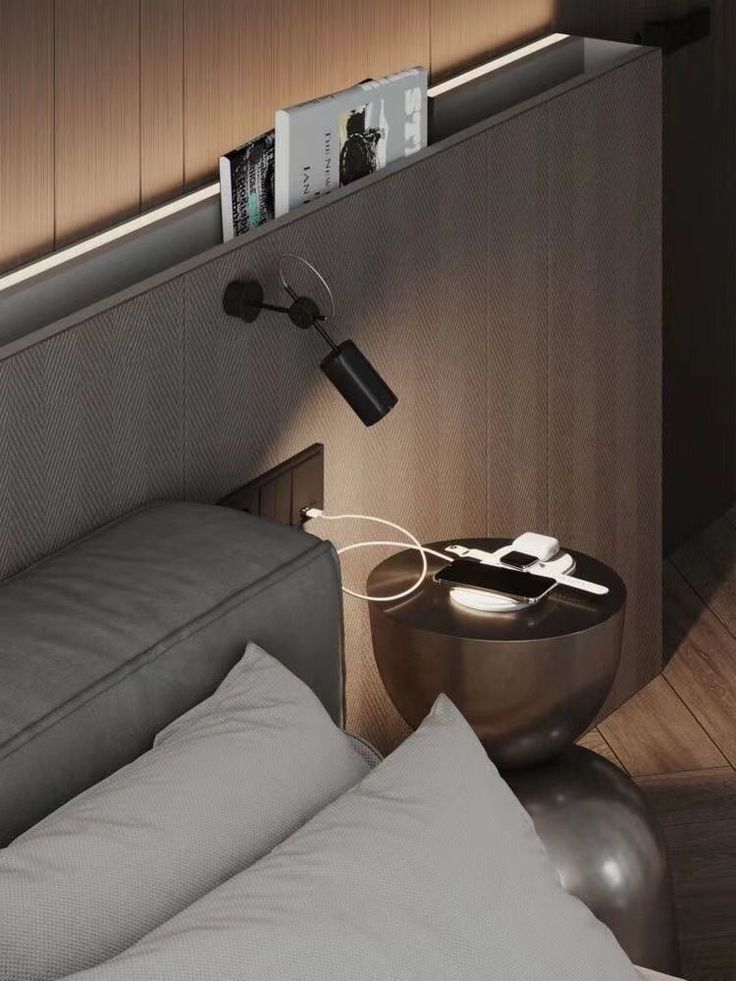 A full-length wooden headboard with an integrated storage ledge. Designed as a continuous panel behind the bed, it keeps essentials within reach while maintaining a clean, uncluttered front.