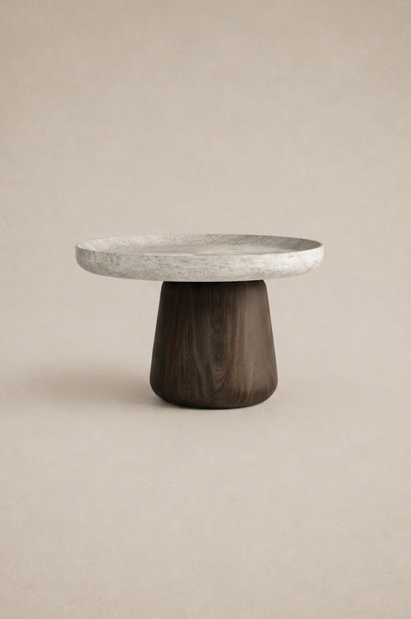 A compact table featuring a stone top and sculpted wood base. Its elevated height makes it ideal as a side table or part of a nested coffee table set, while maintaining the material contrast and soft form of the collection.