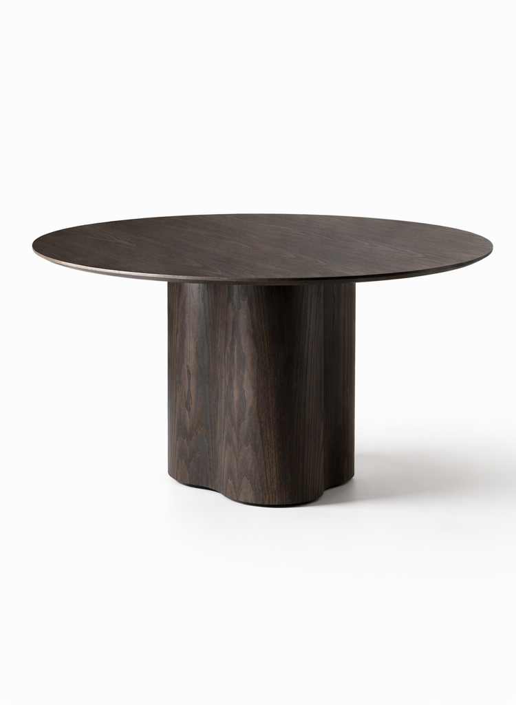 A minimal round dining table defined by a solid cylindrical base and a thin, refined top profile. The design emphasizes proportion and materiality, with a continuous wood grain wrapping the base and a softly beveled edge to lighten the visual weight of the top. Designed for everyday dining with a calm, architectural presence.