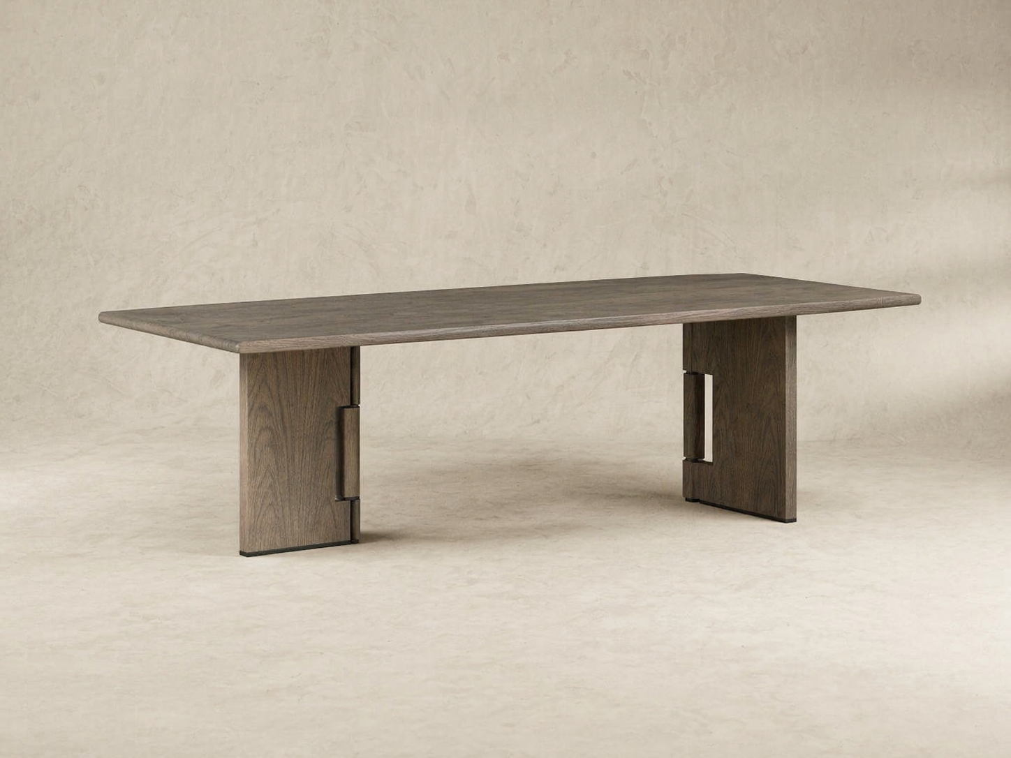A rectangular work table designed for team collaboration, supported on two solid base elements with subtle detailing. The clean form provides a practical surface for everyday tasks while maintaining a refined, minimal presence.