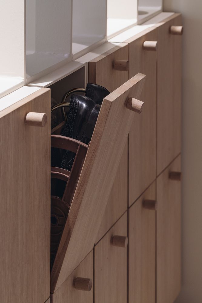A compact shoe cabinet with angled doors that open smoothly for easy access. Designed to keep entryways organized while maintaining a clean, minimal front.